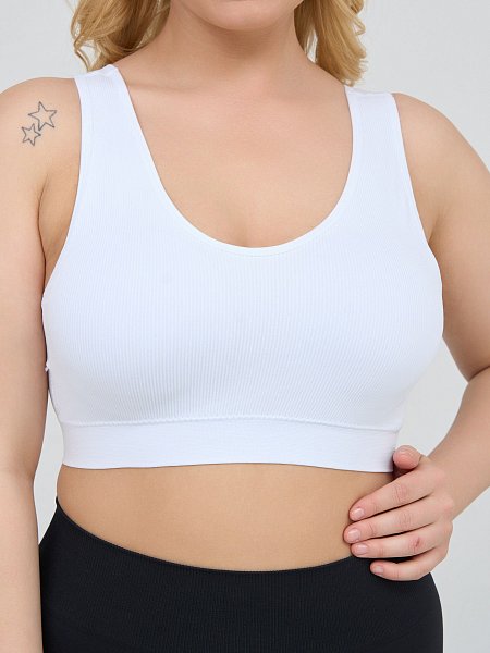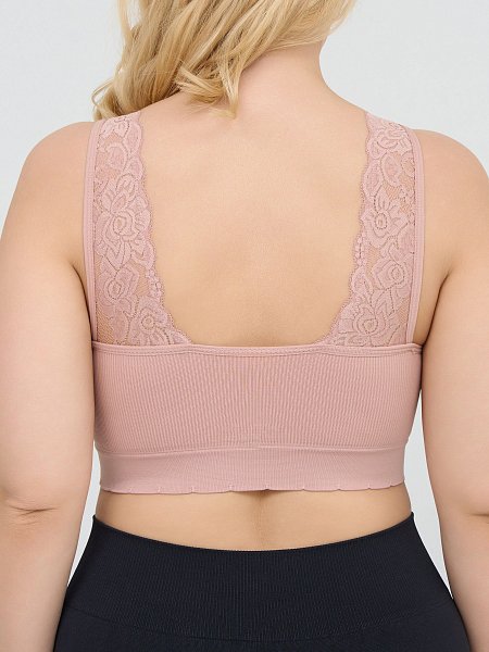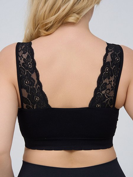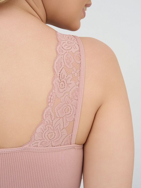 Топ-бралетт в мелкий рубчик, со скрытым (внутренним) подкроем для комфортного удержания груди, широкие бретели украшены кружевом на спинке, формованные вставки вынимаются, очень комфортный, микрофибра, V-образный вырез делает фигуру зрительно стройнее.