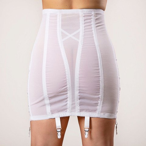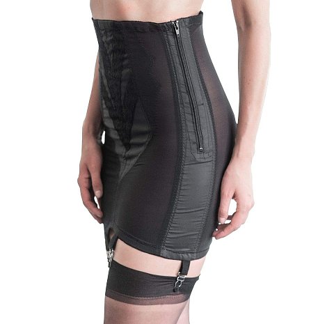 Корсетный пояс для чулок очень сильной коррекции с завышенной талией. Данная модель позволяет отлично сформировать фигуру за счет комбинации нейлоновой и сатиновой тканей, которые скроены таким образом, что убирают лишни сантиметры, не создавая чувства дискомфорта при использовании. Усиленная вставка на передней панели корректирует живот, а специальные косточки вмести с особым кроем формируют линию талии и боков. Для удобства надевания и использования имеется застежка-молния, которая изнутри дублируется крючками. Имеется 6 металлических застежек для чулок.