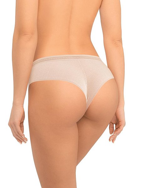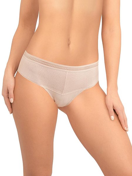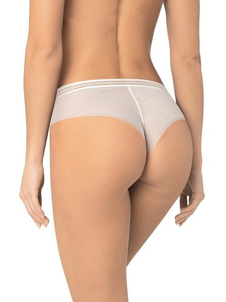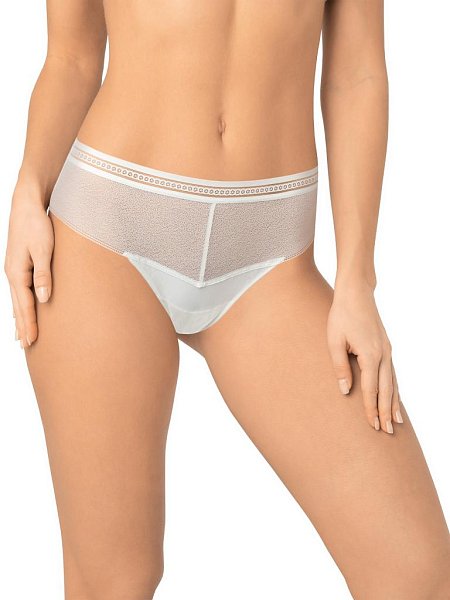 Трусы-бразилиана со средней линией талии. Передняя и задняя детали выполнены из цельнокройного кружева с сетчатой структурой. Широкая декоративная резинка, использованная для обработки талии, придает изделию ультрамодное звучание. Хлопковая ластовица. Упаковка - индивидуальная картонная коробочка.