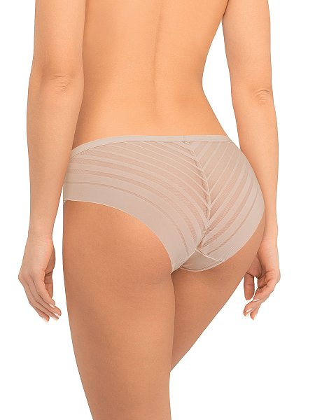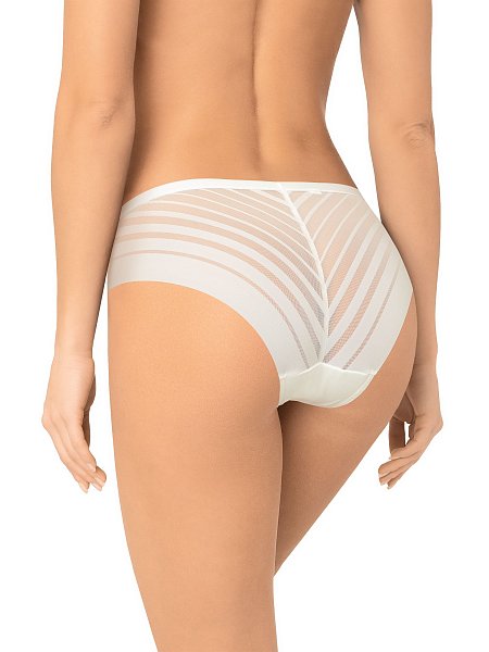 Трусы-слип со средней линией талии. Передняя деталь выполнена из мягкой микрофибры, задняя деталь - из декоративного полотна с чередующимися полосками разной ширины. Спереди вырез ножки обработан тонкой тесьмой. По талии пришита деликатная эластичная тесьма. В изделии отсутствуют боковые швы, что делает его максимально комфортным и незаметным под одеждой. Хлопковая ластовица.