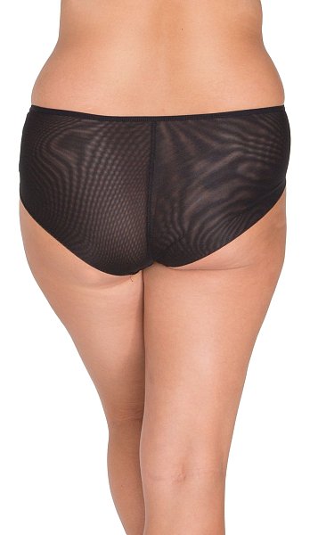 Трусики-слип спереди из сетки, продублированной хлопковым трикотажем, по бокам вставки из сетки с вышивкой оранжевой и фиолетовой нитями с люрексом с внешней стороны покрыты черной сеткой, спинка из сетки, сложенной вдвое, с вертикальным швом. Ластовица проложена 100% хлопком.
