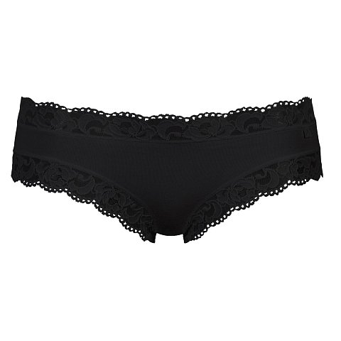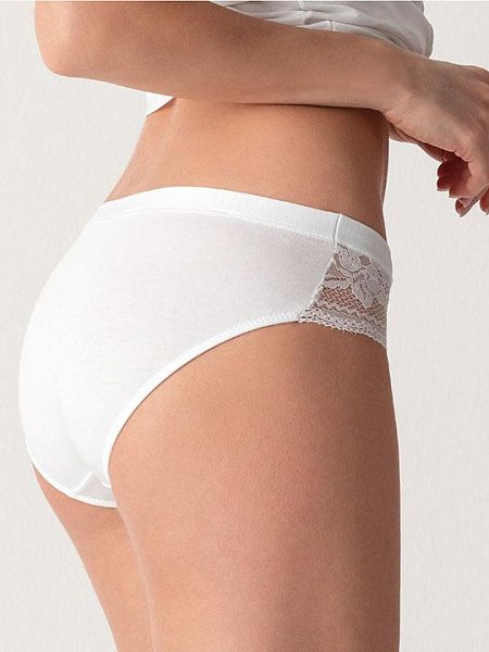 Женственные и обольстительные трусы из хлопкового эластичного полотна. Средняя высота посадки. Широкое кружево с задней панели переходит на переднюю, образуя декоративные вставки по бокам. Передняя панель гладкая, с двумя декоративными бантиками на линии талии. Вырезы по ноге на передней панели обработаны узкой резинкой с резным краем. Ластовица: 100% хлопок.