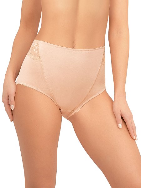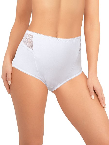 Трусы-слип с завышенной линией талии, выполнены из хлопкового полотна с содержанием эластана. Передняя деталь продублирована неэластичной сеткой для придания изделию корректирующего эффекта в области живота. На передней детали вставки из кружева с цветочным рисунком. Линия талии и вырезы ножек обработаны эластичной тесьмой с деликатным фестончатым краем. Хлопковая ластовица.