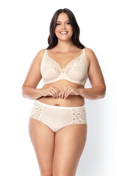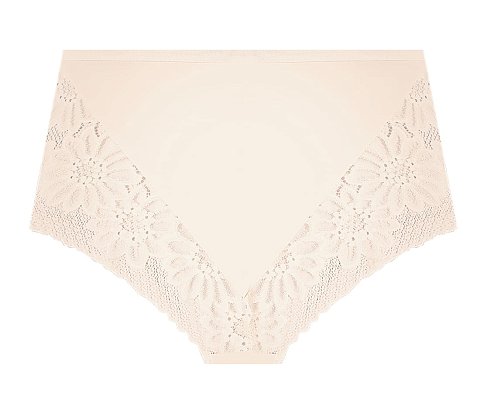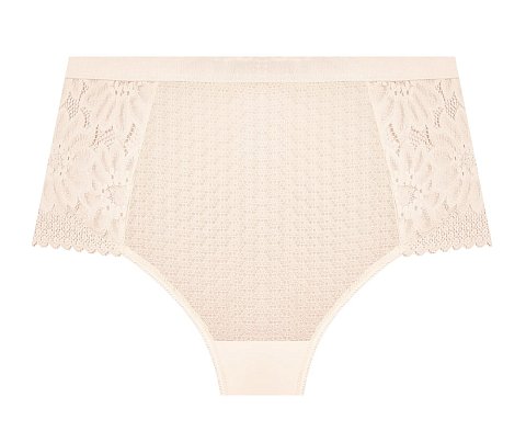Трусики-слипы с высокой линией талии Carmela из кружевного полотна и сетки, продублированы спереди трикотажем в тон, спинка кружевная с V-образной трикотажной вставкой. Ластовица из 100% хлопка.