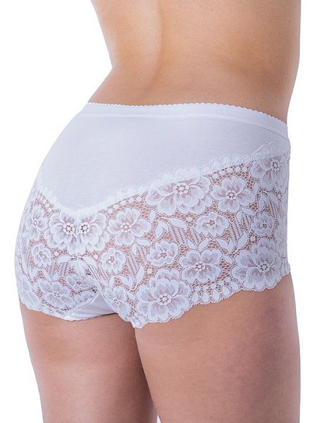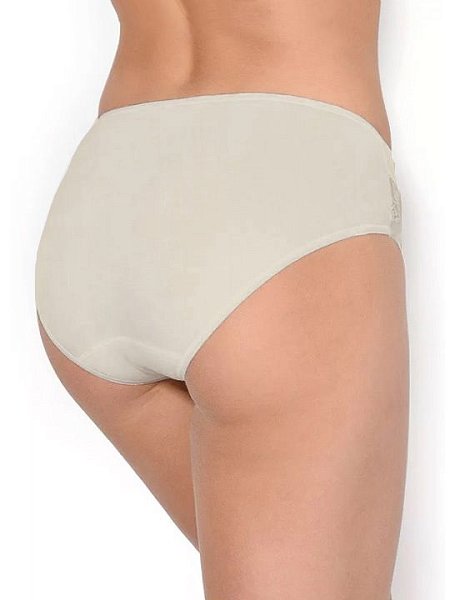 Трусики-слип спереди из эластичного трикотажного полотна, продублированного сеткой, со вставками из сетки телесного цвета с вышивкой белой нитью. Спинка из эластичного трикотажного полотна, проймы ног из сетки, сложенной вдвое. Ластовица проложена 100% хлопком.